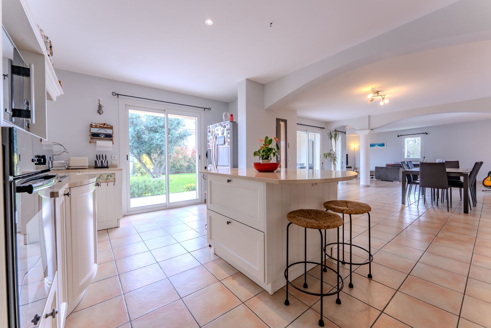 Le rez-de-chaussée s’articule autour d’un vaste espace de vie de 76 m² comprenant un salon-séjour et une cuisine ouverte parfaitement équipée, baignée de lumière grâce aux doubles baies vitrées. Les volets roulants électriques ajoutent une touche de confort moderne.